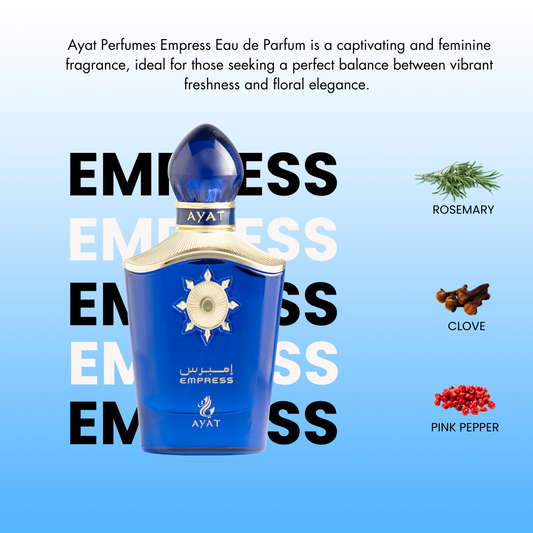 Ayat Perfumes Empress Eau de Parfum is a captivating and feminine fragrance, ideal for those seeking a perfect balance between vibrant freshness and floral elegance. This unique composition combines fruity, floral and woody notes, offering a soft and sophisticated olfactory experience.