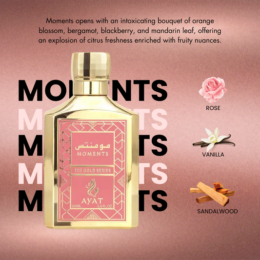 MOMENTS 100ml by Ayat Perfumes is inspired by the beauty of Arabian gardens. Made in Dubai with high-quality ingredients, it offers a fresh and long-lasting scent that stays with you all day.