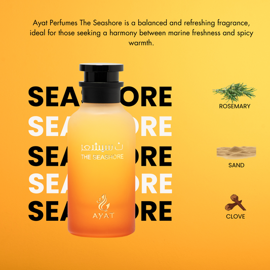 Ayat Perfumes The Seashore is a balanced and refreshing fragrance, ideal for those seeking a harmony between marine freshness and spicy warmth. This unique composition captures the essence of sea, sand and spices, offering a soothing and invigorating olfactory experience.